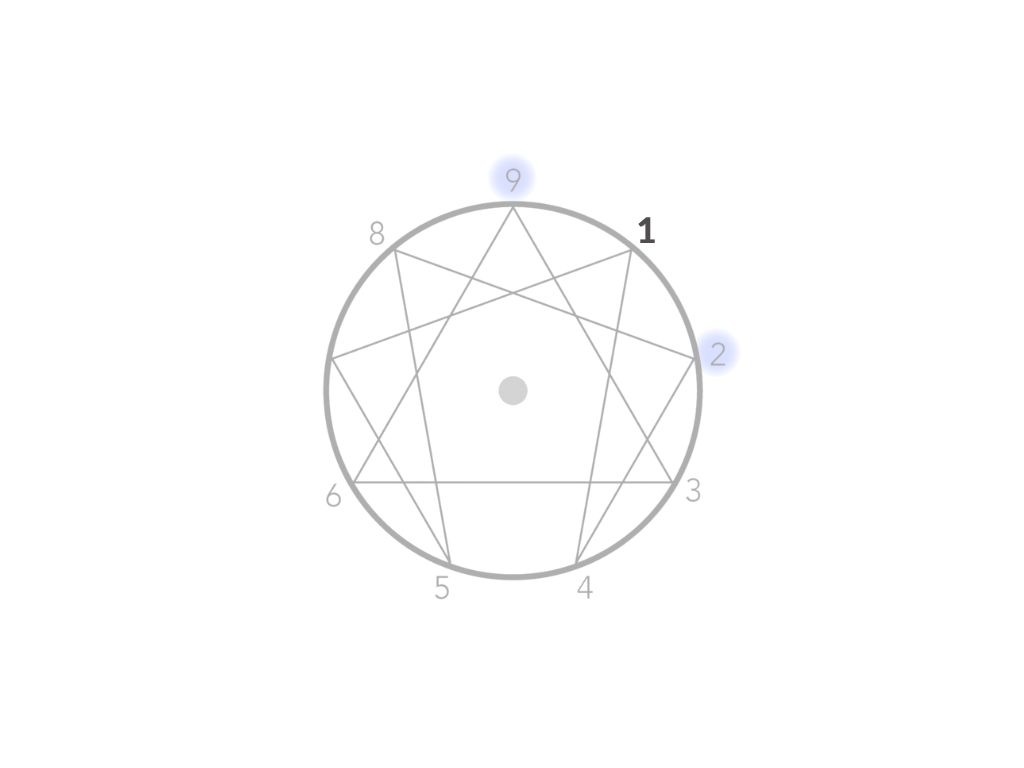 La ala del eneatipo 1 con tendencia al eneatipo 9: puede mostrar rasgos más suaves y tranquilos. Los Uno con ala Nueve pueden tener una mayor capacidad para relajarse y disfrutar del presente. Son más propensos a buscar la paz y la armonía, y pueden tener una visión más amplia y tolerante de las cosas.