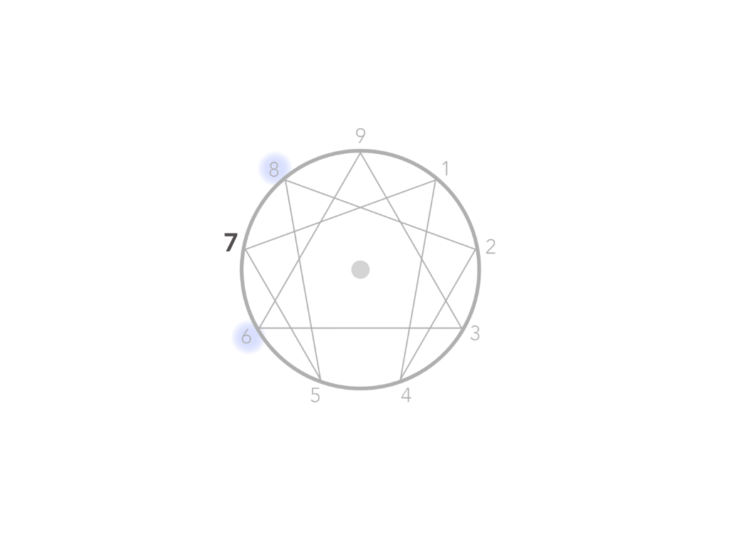 La ala del eneatipo 7 con tendencia al eneatipo 6: puede mostrar rasgos más orientados a la seguridad y la lealtad. Los Sietes con ala Seis pueden ser más cautelosos y enfocados en anticipar y enfrentar los desafíos o peligros potenciales. Tienden a ser más colaborativos y pueden buscar la aprobación y el apoyo de los demás en su búsqueda de experiencias emocionantes y estimulantes.